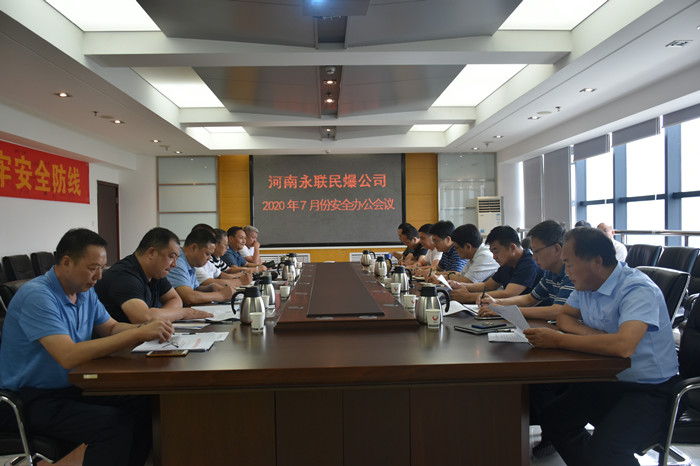 2020年7月30日,河南省永聯民爆器材股份有限公司召開了7月份安全辦公會議,公司領導班子、安委會成員、安委會辦公室成員以及禹州、駐馬店市、安陽市、靈寶市、舞鋼市、汝陽等6家分公司負責人參加了會議。會議由公司副總經理靳義國主持,公司董事長、總經理劉嵩參加會議并講話。