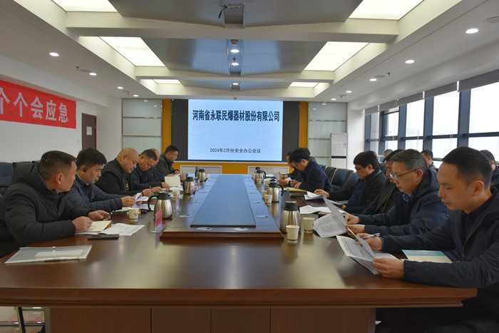 2024年2月29日,河南省永聯民爆器材股份有限公司召開了2月份安全辦公會議,公司領導班子、安委會成員、安委會辦公室成員以及駐馬店市、嵩縣、舞鋼市、焦作市、衛輝市、鄧州市等6家分公司負責人參加了會議。會議由公司副總經理靳義國主持,公司董事長、總經理劉嵩參加會議并講話。